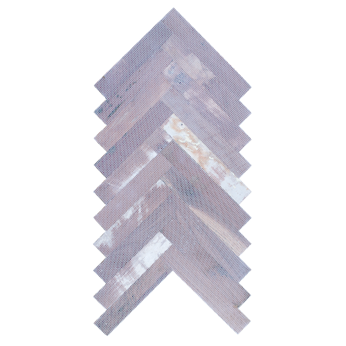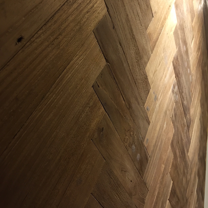Made from solid recycled teak wood in classic pattern of Herringbone, with natural erosion in the surfaces and natural finish look.